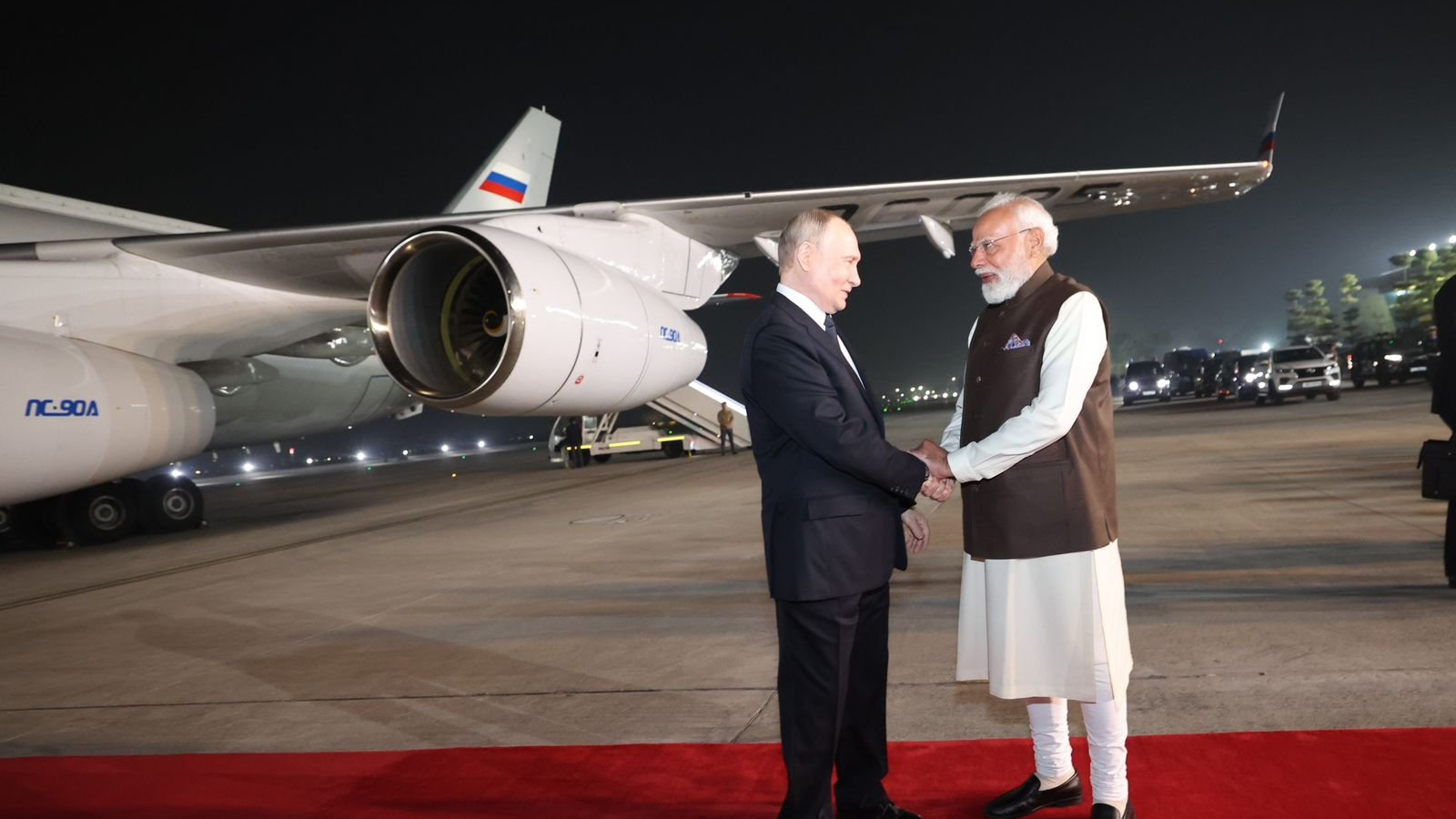 दिल्ली एयरपोर्ट पर रूसी राष्ट्रपति व्लादिमीर पुतिन का ग्रैंड वेलकम करते पीएम मोदी।