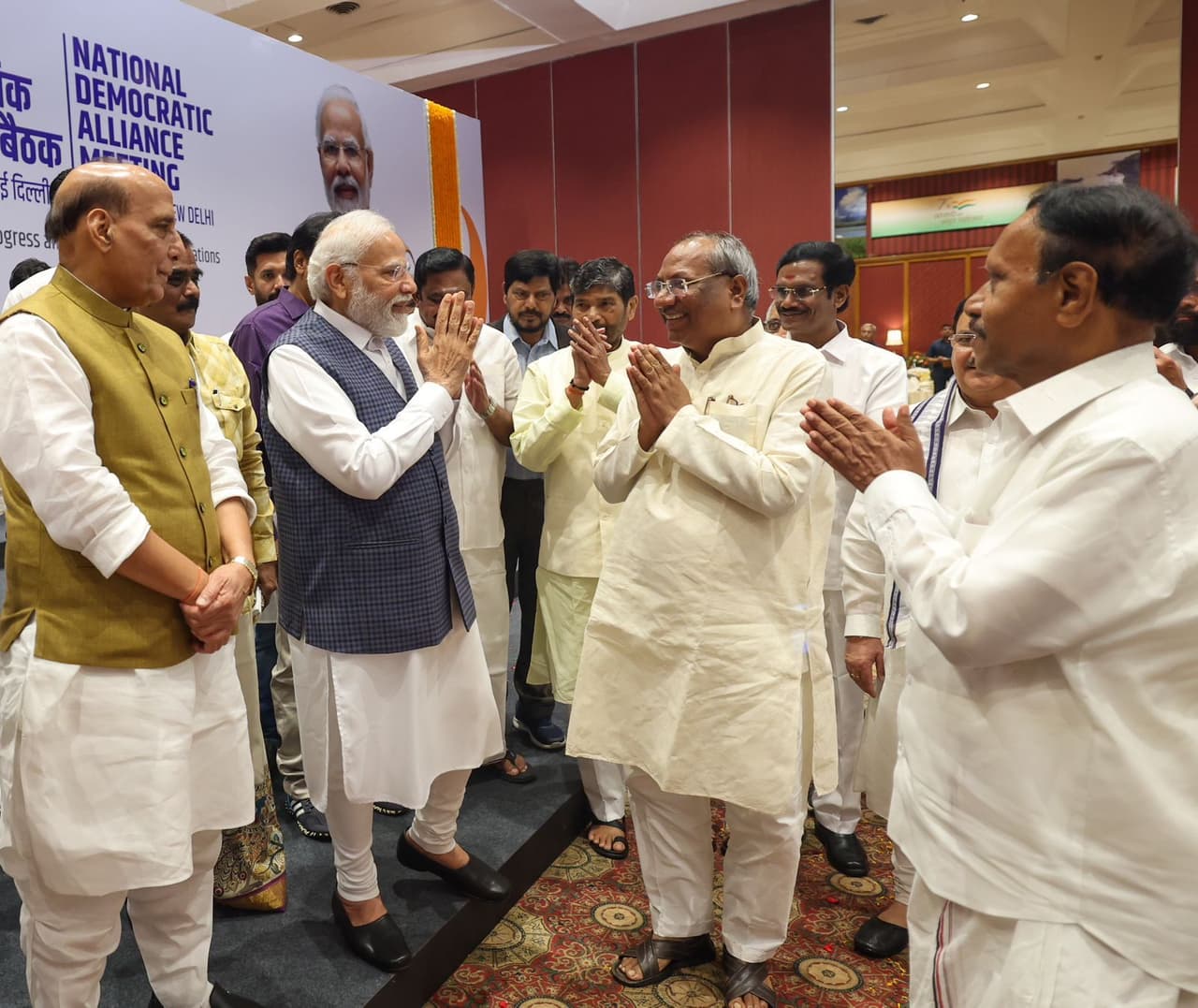 मीटिंग में पहुंचे प्रधानमंत्री मोदी ने एनडीए कुनबे के एक-एक नेताओं से मुलाकात की है। यूपी के मंत्री और निषाद पार्टी के नेता डॉ.संजय निषाद ने जब हाथ जोड़कर नमस्कार किया तो पीएम ने भी हाथ जोड़कर अभिवादन किया।