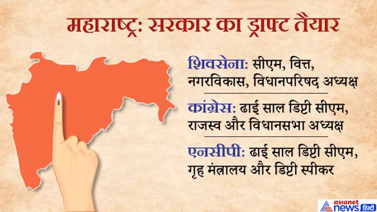 मुंबई. महाराष्ट्र की सियासत में जारी उठापटक के बीच राष्ट्रपति शासन लगने के तीन दिन बाद नई सरकार की सुगबुगाहट फिर तेज हो गई है। गुरुवार को पहली बार सरकार बनाने के लिए शिवसेना,एनसीपी और कांग्रेस के नेता साथ बैठे। जिसमें कॉमन मिनिमम प्रोग्राम का ड्राफ्ट तैयार किया गया है। असहमति के मुद्दे को दरकिनार कर महाराष्ट्र की जनता को ध्यान में रख कर सरकार का एजेंडा तैयार किया गया। सूत्रों के मुताबिक अंतिम फैसला सोनिया, पवार और उद्धव फाइनल करेंगे। ड्राफ्ट के मुताबिक शिवसेना ने जो प्रस्ताव रखा है इसमें जो बाते सामने आई है उसमें शिवसेना का सीएम होगा। कांग्रेस और एनसीपी के डिप्टी सीएम ढाई-ढ़ाई साल के लिए दोनो दल ले लें। कयास लगाए जा रहे हैं कि 17 नवंबर को सरकार गठन के ऐलान हो सकता है। 17 नवंबर के दिन ही शिवसेना को बनाने वाले स्वर्गीय बालासाहेब ठाकरे की पुण्यतिथि है।