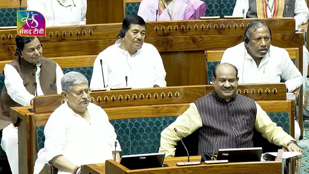 लोकसभा अध्यक्ष के लिए हुए चुनाव के नतीजे घोषित किए जाने तक ओम बिरला सदन की पहली पंक्ति में केंद्रीय मंत्री ललन सिंह के साथ बैठे थे।