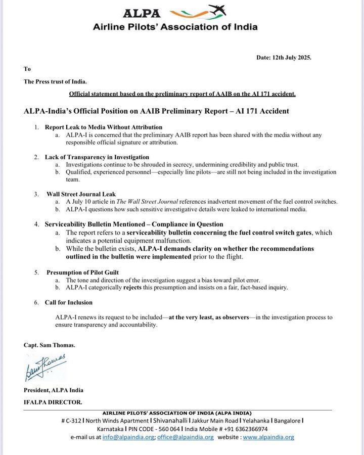 - योग्य विशेषज्ञों की अनुपस्थिति: ALPA का कहना है कि विशेषज्ञों को जांच में शामिल नहीं किया गया।