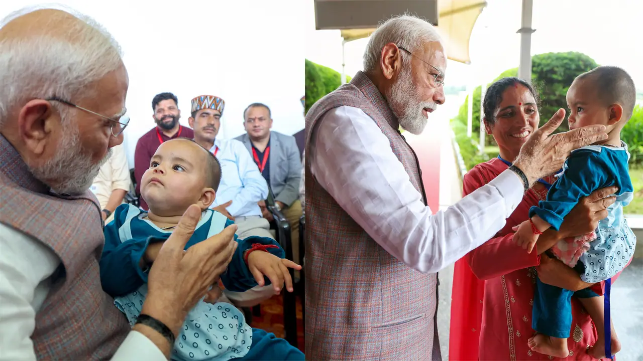 हिमाचल प्रदेश के कांगड़ा में बाढ़ प्रभावित लोगों से मुलाकात के दौरान एक बच्चे को गोद में लेकर प्यार से दुलारते पीएम मोदी।
