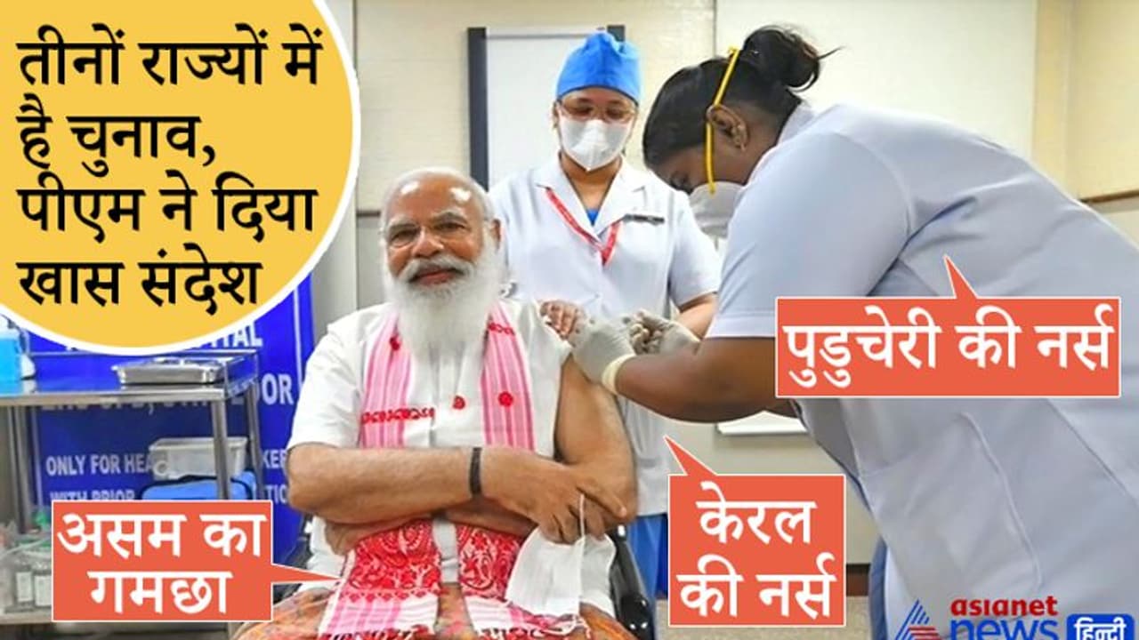 COVAXIN वैक्सीन लगवाने के दौरान पीएम मोदी ने जो गमछा लिया था, वह असम का था। वह गमछा महिलाओं के आशीर्वाद का प्रतीक है। पीएम मोदी इस गमछे में कई कार्यक्रमों में देखे गए हैं।