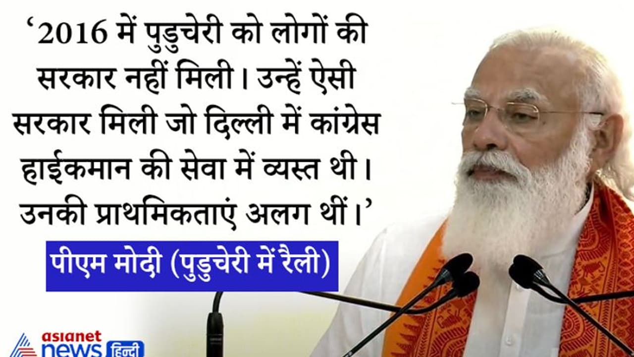 "हाईकमांड कांग्रेस सरकार ने पुडुचेरी में शासन के हर सेक्टर को नुकसान पहुंचाया। कांग्रेस लोगों के लिए काम करने में विश्वास नहीं करती है, मुझे समझ नहीं आता कि कांग्रेस क्यों नहीं चाहती कि कोई दूसरा लोगों के लिए काम करे।"