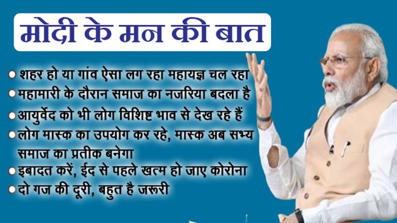 प्रधानमंत्री नरेंद्र मोदी आज सुबह 11 बजे एक बार फिर रेडियो कार्यक्रम 'मन की बात' में देश को संबोधित किया। इस दौरान उन्होंने कहा कि कई ऐसे पहलू जानने को मिले जिस पर आपाधापी में ध्यान ही नहीं जाता। कोरोना के खिलाफ लड़ाई पीपल ड्रिवन है। यह लड़ाई जनता लड़ रही है।