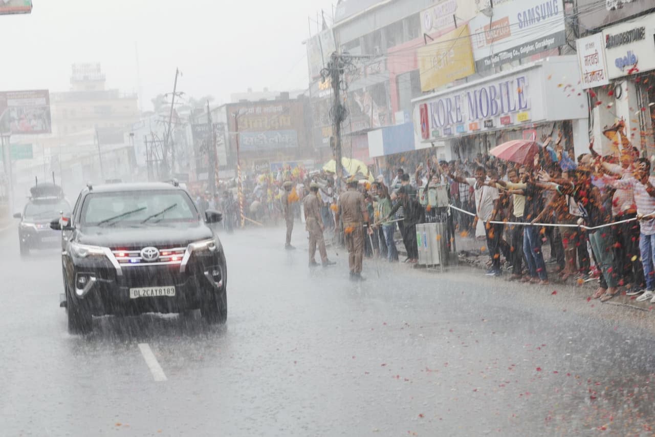 बारिश में भी लोग सड़क किनारे खड़े रहे और भीगते हुए मोदी-मोदी के नारे लगाते रहे। सड़क किनारे खड़े लोगों ने प्रधानमंत्री मोदी के काफिले पर फूलों की बारिश कर स्वागत किया।