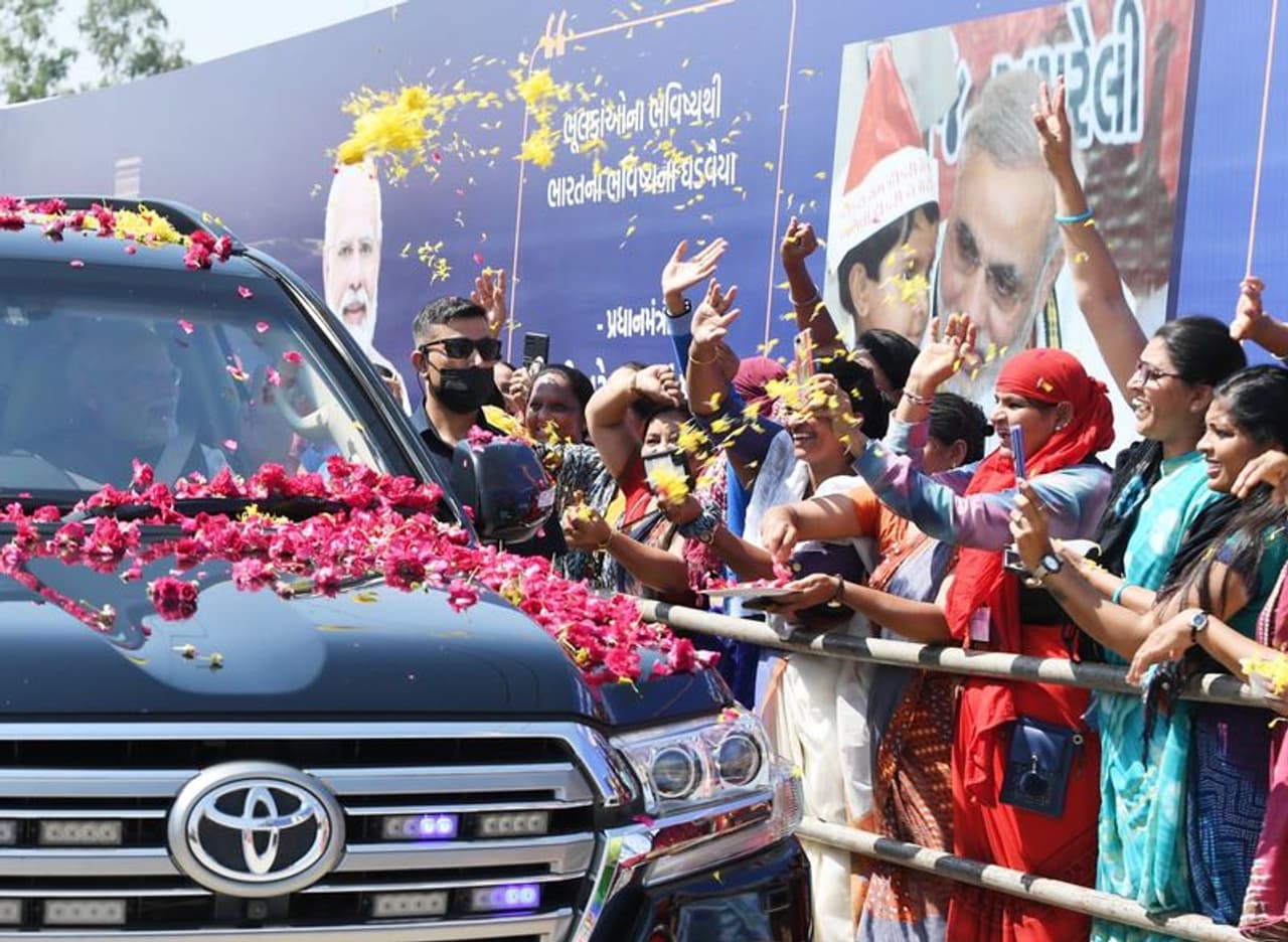 मोदी-मोदी के जयकारे और फूलों की बारिश। गुजरात की धरती पर कुछ इस तरह से पीएम का भव्य स्वागत करने उनके प्रशंसकों की भीड़ सड़क के किनारे लगी रही।