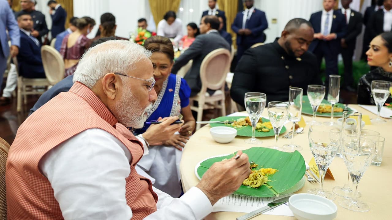 पीएम नरेंद्र मोदी 3 जुलाई को त्रिनिदाद और टोबैगो में थे। पीएम कमला प्रसाद-बिसेसर ने उनके सम्मान में रात्रिभोज का आयोजन किया। इस दौरान मोदी ने सोहारी के पत्ते पर परोसे गए भोजन का आनंद लिया।