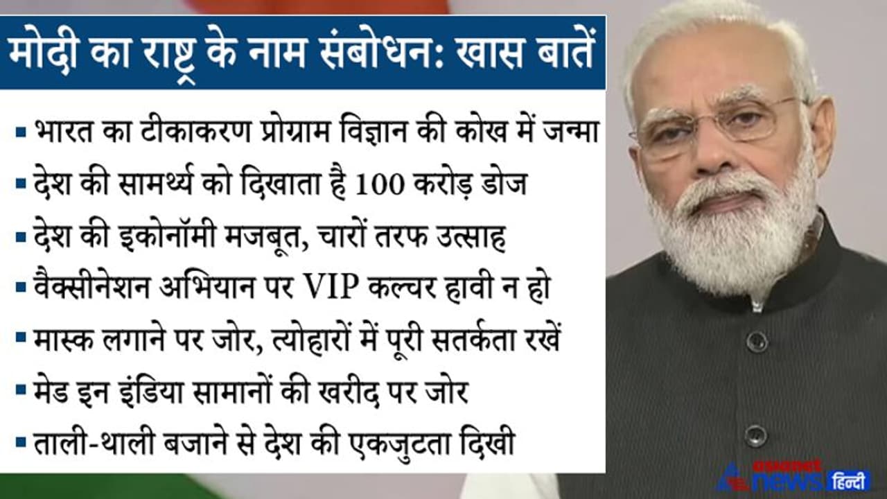 भारत का पूरा वैक्सीनेशन प्रोग्राम विज्ञान की कोख में जन्मा है, वैज्ञानिक आधारों पर पनपा है और वैज्ञानिक तरीकों से चारों दिशाओं में पहुंचा है। हमें हर छोटी से छोटी चीज जो मेड इन इंडिया हो, जिसे बनाने में किसी भारतवासी का पसीना बहा हो, उसे खरीदने पर जोर देना चाहिए और ये सबके प्रयास से ही संभव होगा। 100 करोड़ वैक्सीन डोज़ का एक प्रभाव ये भी होगा कि अब दुनिया भारत को कोरोना से ज़्यादा सुरक्षित मानेगी। एक फॉर्मा हब के रूप में भारत को जो स्वीकृति मिली है उसे और मज़बूती मिलेगी। पूरा विश्व आज भारत की इस ताकत को देख रहा है और महसूस कर रहा है।