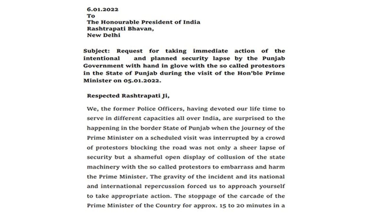 पूर्व अधिकारियों ने पत्र में लिखा है कि मीडिया रिपोर्ट्स बताती हैं कि यह सिर्फ राज्य सरकार की लापरवाही नहीं है, बल्कि घटना से साफ नजर आ रहा है कि इसमें राज्य सरकार की मिलीभगत रही है। राज्य सरकार को उन वैकल्पिक मार्गों की भी जानकारी थी, जो पीएम की यात्रा के लिए तय किए गए थे, लेकिन सरकार ने उन्हें नहीं अपनाया। हम आपको यह पत्र इसलिए लिख रहे हैं, क्योंकि इतिहास में यह पहले कभी नहीं हुआ कि राज्य की एजेंसियां अपनी जिम्मेदारी टालने के लिए कोई न कोई बहाना बनाएं। मुख्यमंत्री ने भी जो बयान दिया वह भी विरोधाभासी है।
