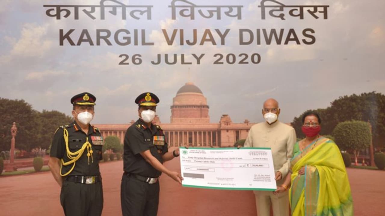 बयान जारी कर बताया गया है, करगिल में अपनी जान की बाजी लगा देने वाले बहादुरों को श्रद्धांजलि देने के लिए आज राष्ट्रपति रामनाथ कोविंद ने दिल्ली आर्मी हॉस्पिटल में 20 लाख का चेक दिया। कोरोना महामारी से लड़ने के लिए इसका इस्तेमाल किया जाएगा।