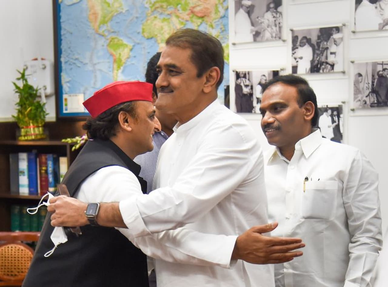सपा नेता अखिलेश यादव राकांपा नेता प्रफुल्ल पटेल को को गले लगाते हुए।
