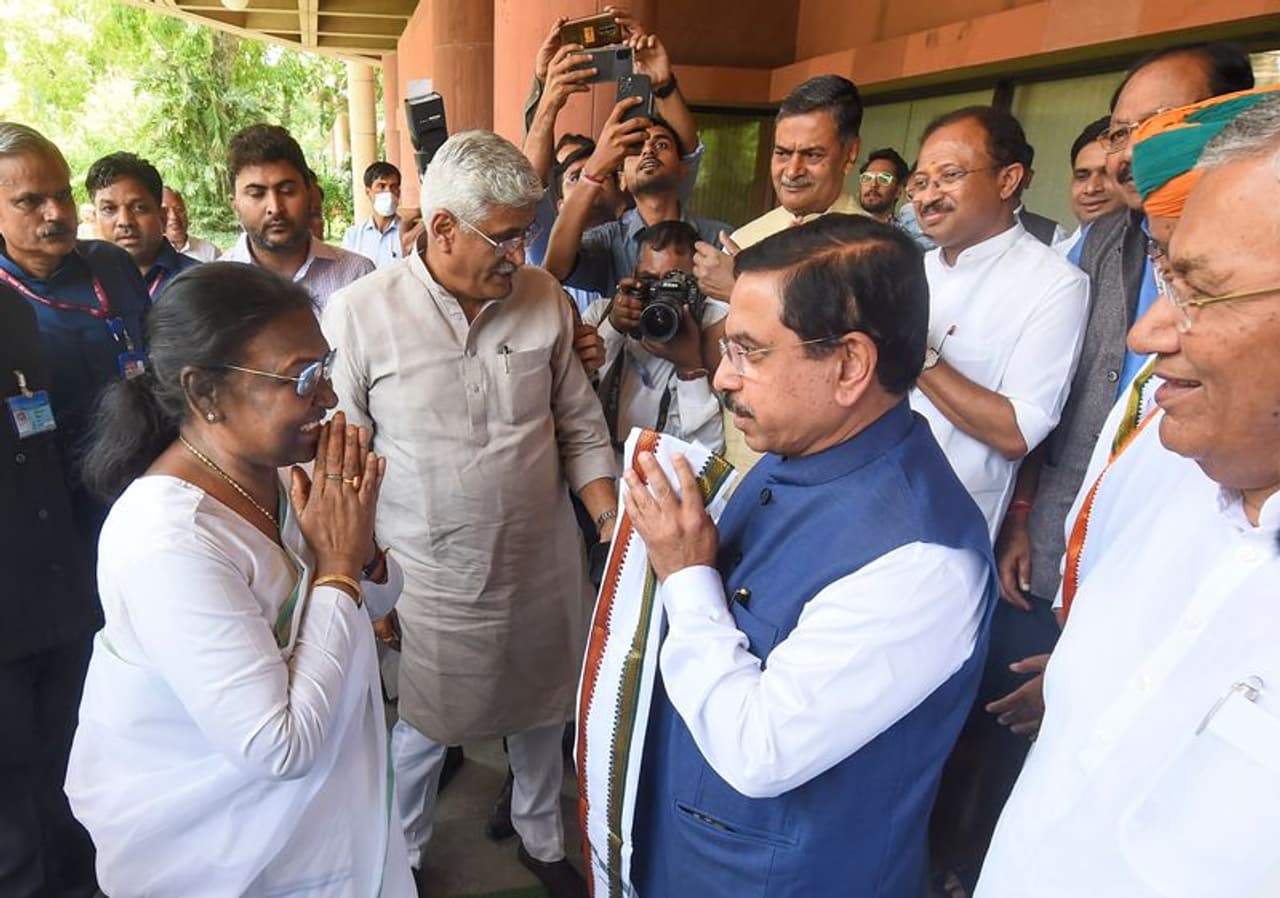 (द्रौपदी मुर्मू का संसदीय कार्य मंत्री प्रल्हाद जोशी ने स्वागत किया।)