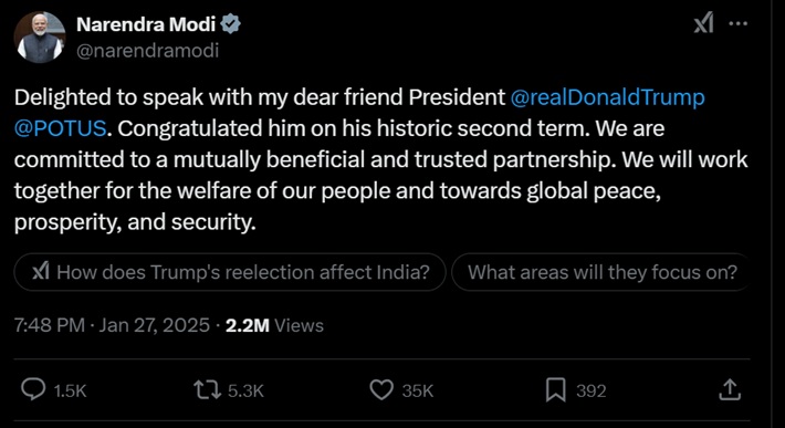 नरेंद्र मोदी ने X पर पोस्ट किया, "अपने प्रिय मित्र राष्ट्रपति डोनाल्ड ट्रंप से बात कर बहुत खुशी हुई। उन्हें उनके ऐतिहासिक दूसरे कार्यकाल के लिए बधाई दी। हम पारस्परिक रूप से लाभकारी और भरोसेमंद साझेदारी के लिए प्रतिबद्ध हैं। हम अपने लोगों के कल्याण और वैश्विक शांति, समृद्धि और सुरक्षा के लिए मिलकर काम करेंगे।"