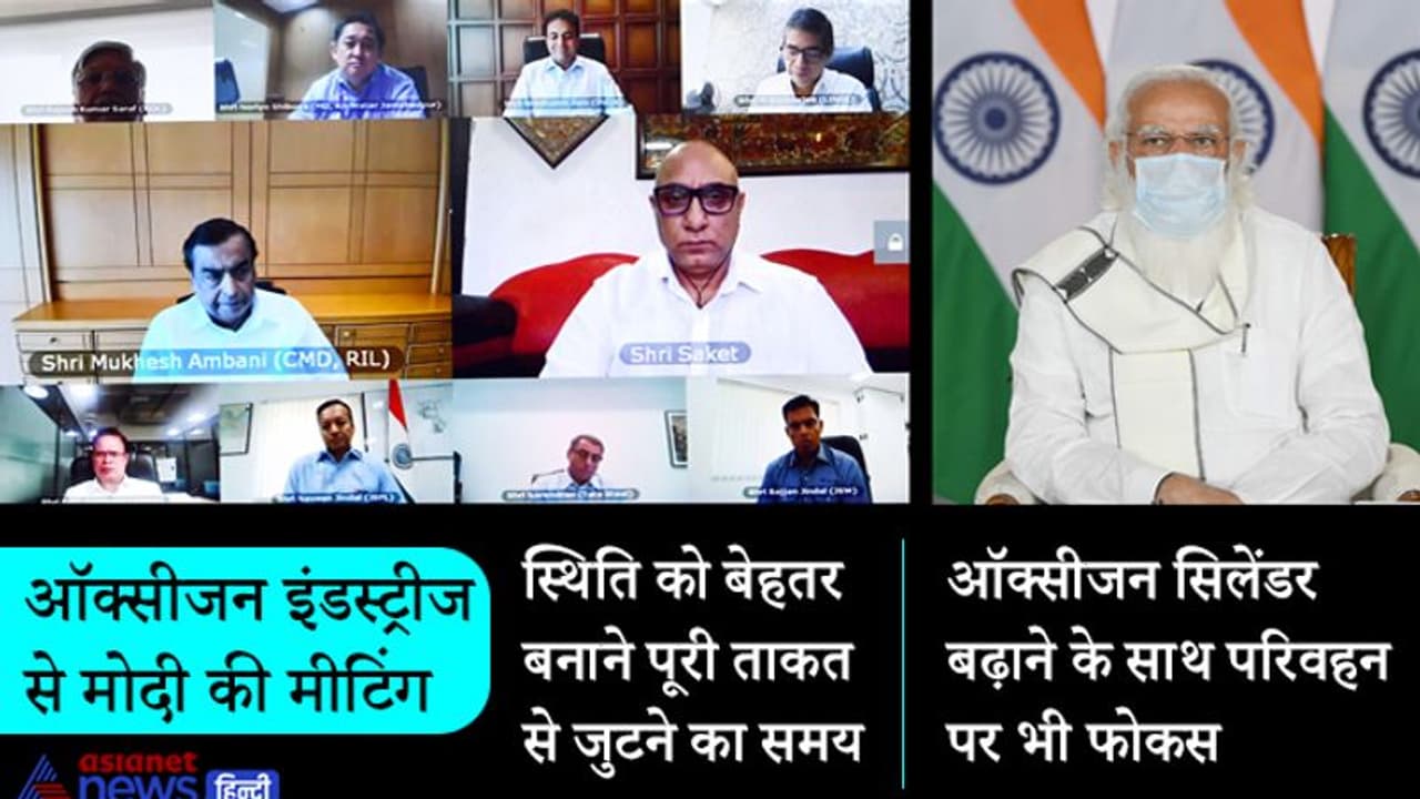 कोरोना संकट के बीच देशभर में मेडिकल ऑक्सीजन की कमी ने लोगों की सांसें अटका रखी हैं। हालांकि केंद्र सरकार के एक्शन में आते ही ऑक्सीजन की कमी धीरे-धीरे दूर होती जा रही है। इस मुद्दे पर शुक्रवार को प्रधानमंत्री नरेंद्र मोदी ने ऑक्सीजन निर्माताओं के साथ एक अहम मीटिंग की। इस वर्चुअल मीटिंग में रिलायंस इंडस्ट्रीज के मालिक मुकेश अंबानी सहित देश के कई बड़े बिजनेसमैन और ऑक्सीजन इंडस्ट्रीज से जुड़े लोग शामिल हुए।