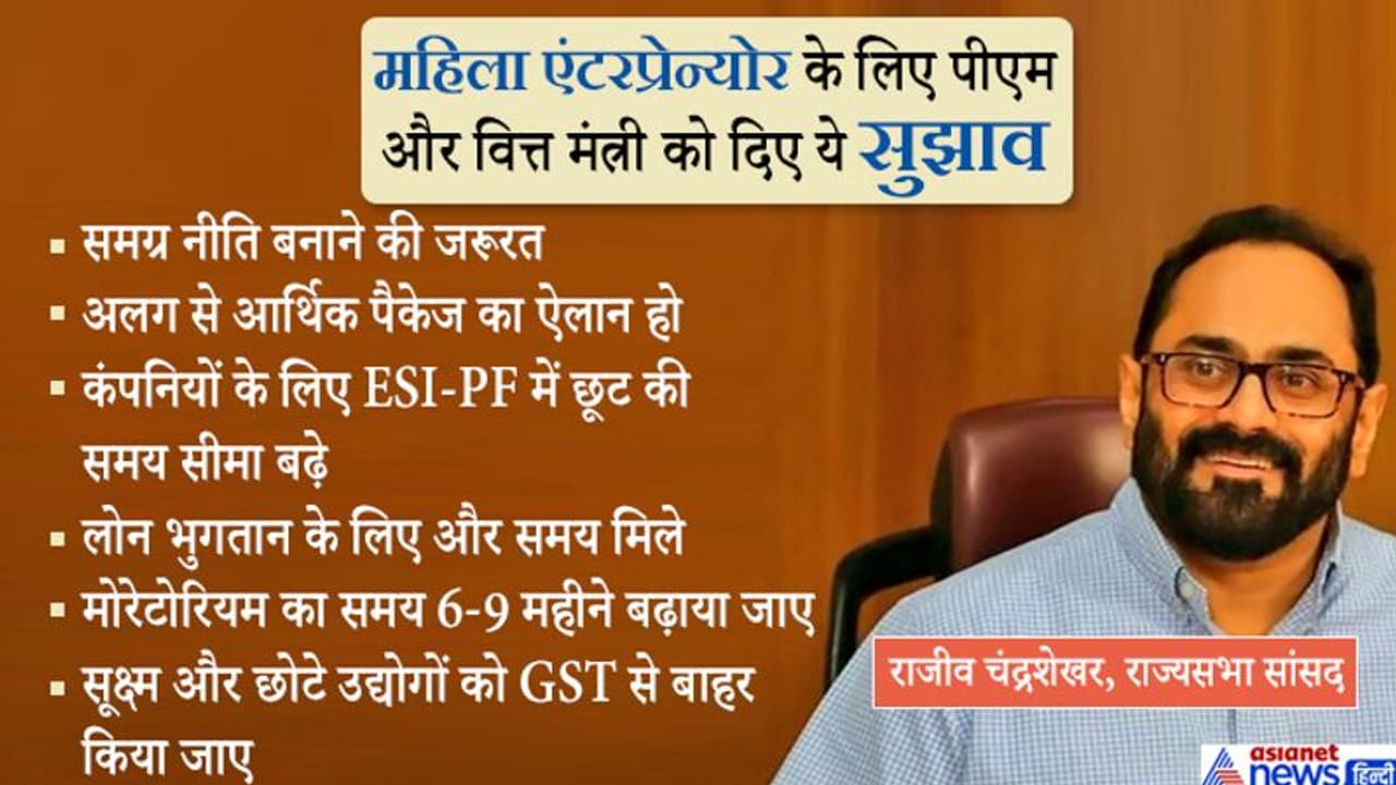 - राजीव चंद्रशेखर ने लिखा, महिला एंटरप्रेन्योर के लिए अलग और समग्र नीति बनाने की जरूरत है। इसके अलावा उन्हें अलग से आर्थिक पैकेज मिले, जिससे वे अपने बिजनेस को फिर से रफ्तार दे सकें।