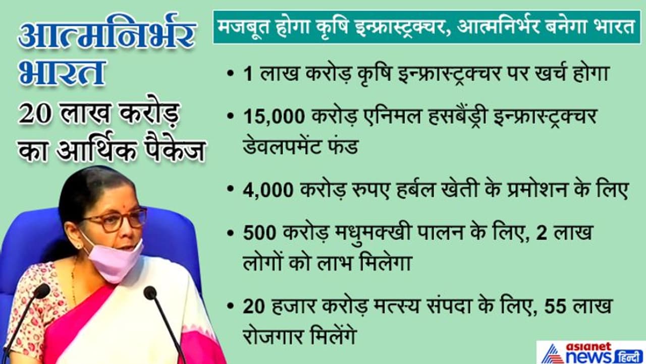तीसरा दिन : 1.50 लाख करोड़ रुपए का प्रावधान- तीसरे दिन वित्त मंत्री ने किसानों से संबंधित कई ऐलान किए। सरकार ने तीसरे दिन 1.50 लाख करोड़ की योजनाओं की घोषणा की। इसमें 1 लाख करोड़ कृषि इन्फ्रास्ट्रक्चर पर खर्च करने का प्रावधान किया गया।