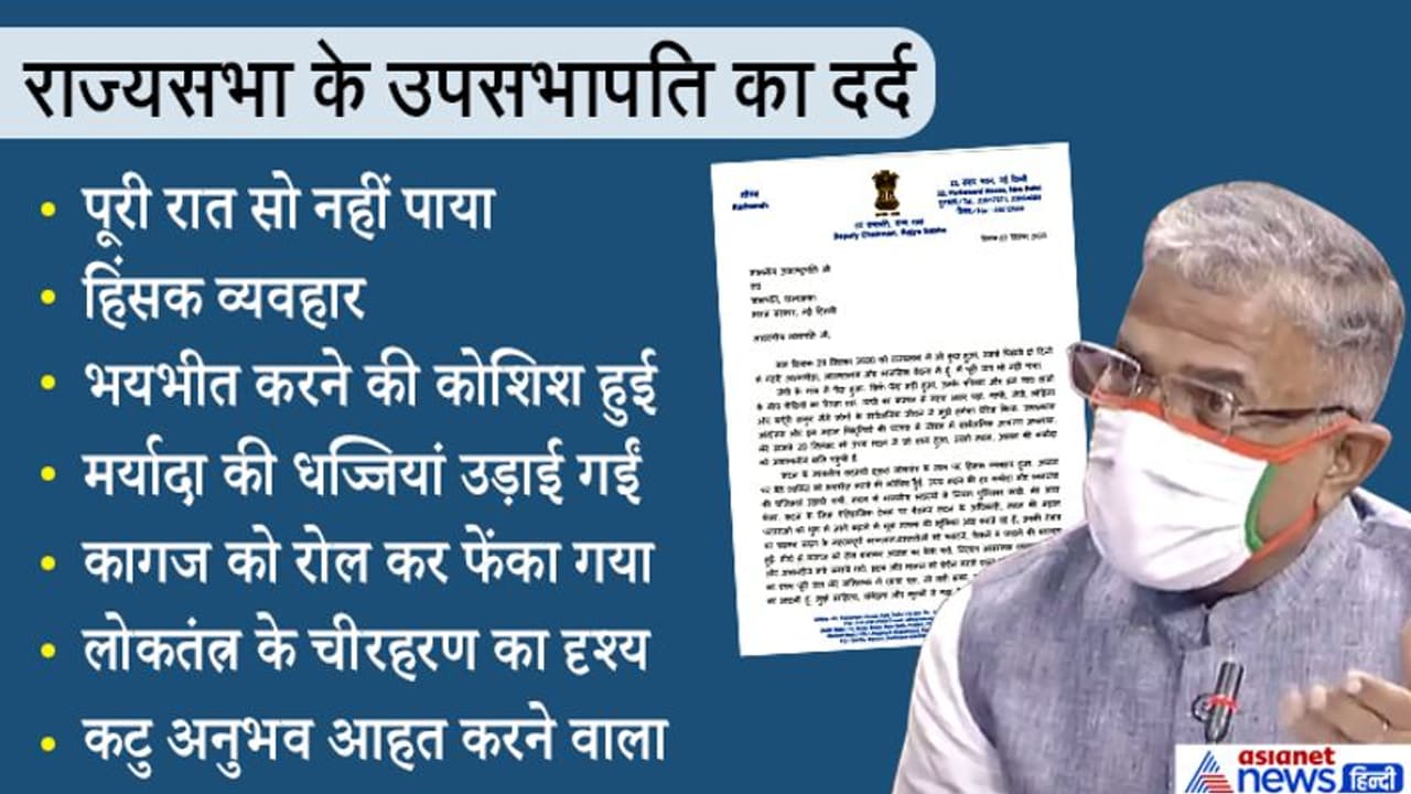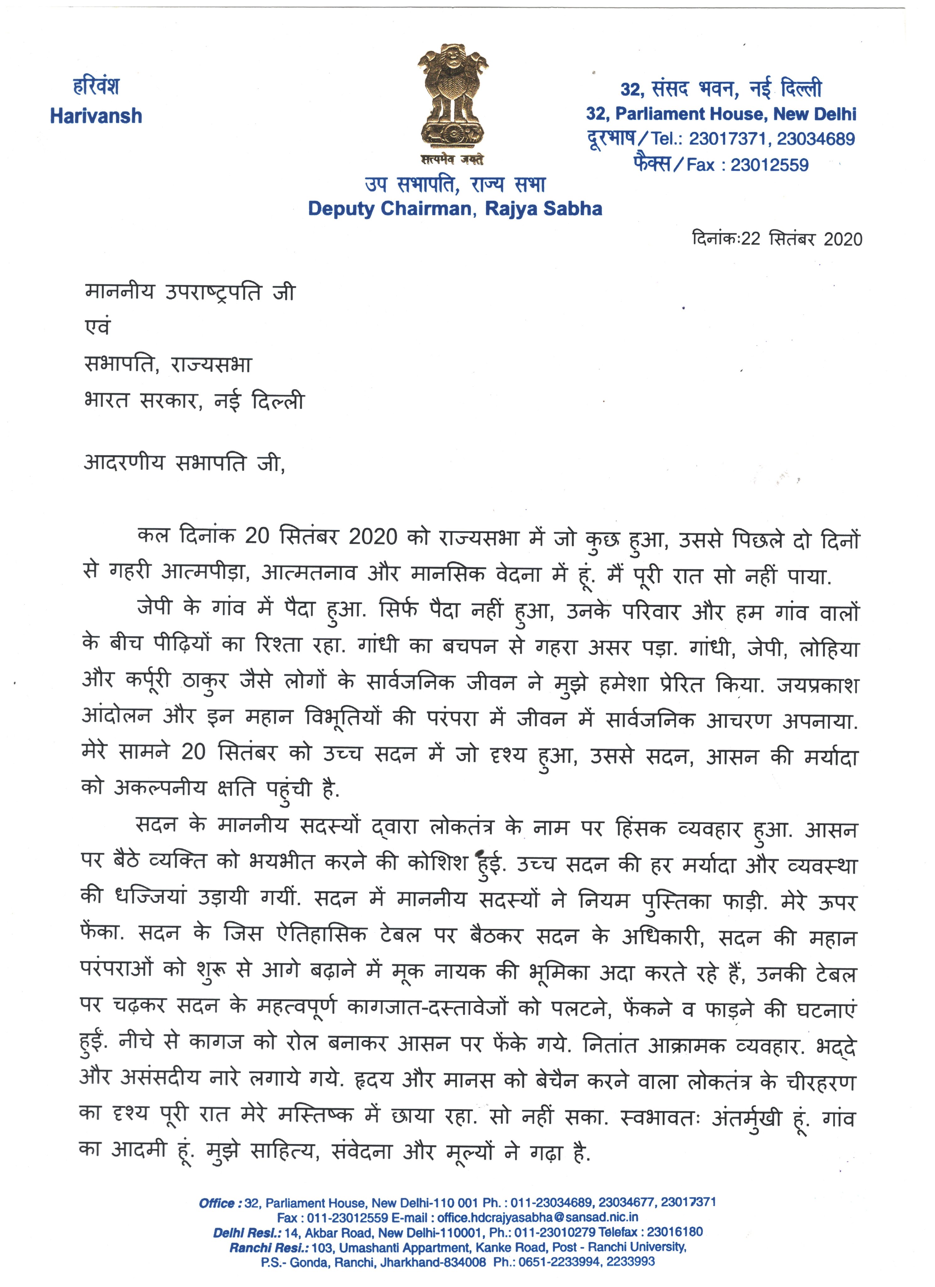 कृषि बिलों के विरोध में राज्यसभा में हंगामा करने की वजह से 8 सांसद पूरे सत्र के लिए निलंबित किए गए हैं। सांसदों के निलंबन के बाद राज्यसभा उपसभापति हरिवंश सिंह ने राज्यसभा सभापति को पत्र लिखकर अपना दुख जाहिर किया। उन्होंने लिखा कि मेरे साथ जो हुआ, उससे पिछले दो दिनों से गहरी आत्मपीड़ा, आत्मतनाव और मानसिक वेदना में हूं। मैं पूरी रात सो नहीं पाया।