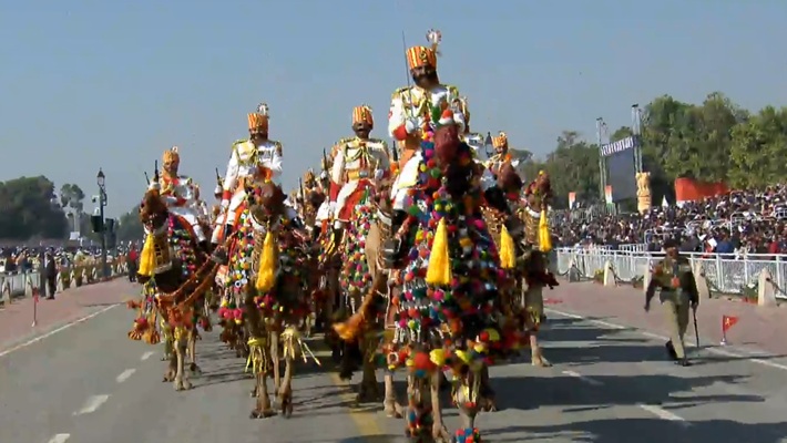 गणतंत्र दिवस 2025 परेड में बीएसएफ के जवान ऊंट पर सवार होकर आए। ऊंटों को बेहद खास परिधानों से सजाया गया था। राजस्थान के रेगिस्तानी इलाके में ऊंट सीमा की रखवाली में बहुत काम आते हैं।