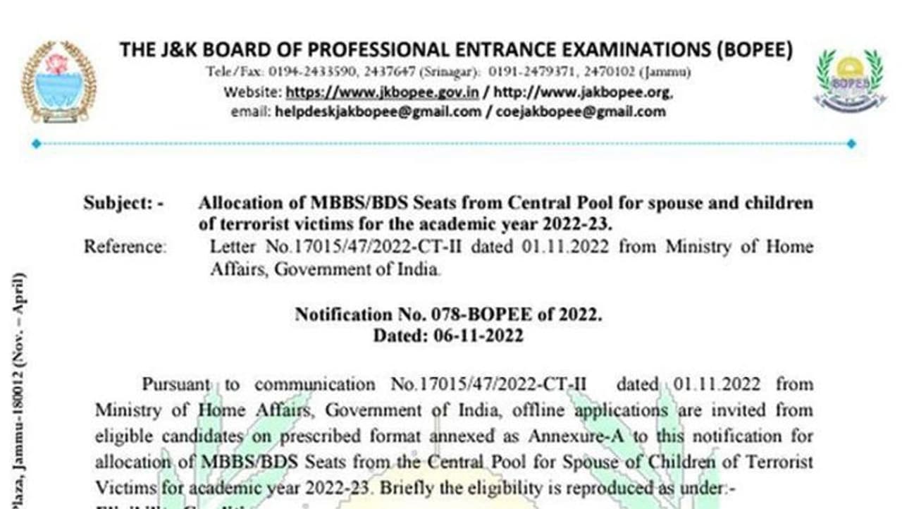 केंद्रीय गृह मंत्रालय ने जम्मू-कश्मीर में आतंकवाद का शिकार हुए पीड़ितों की पत्नी और बच्चों के लिए केंद्रीय पूल से एमबीबीएस/बीडीएस सीटें आवंटित की हैं। ये सीटें शैक्षणिक सत्र 2022-23 के लिए रिजर्व की गई हैं।
