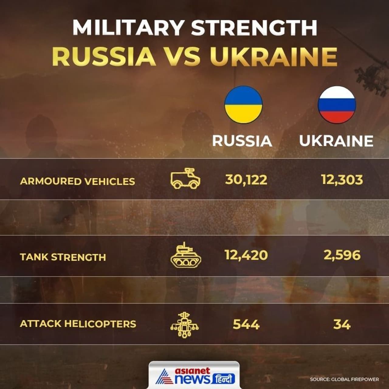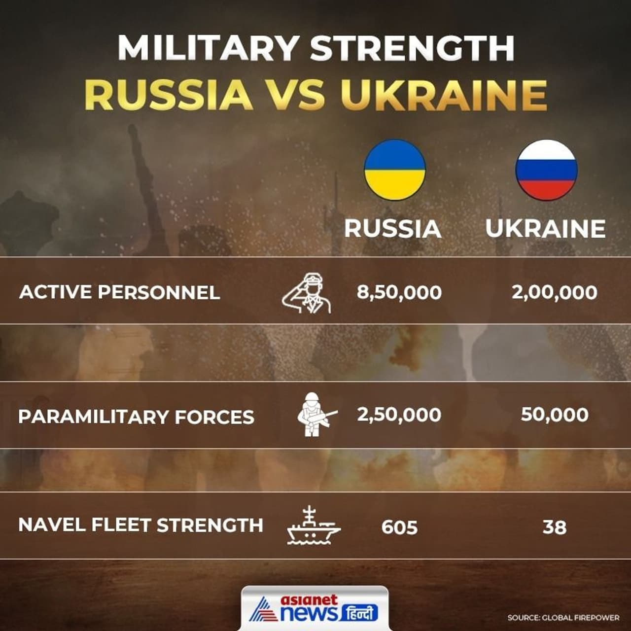 बता दें कि रूसी सशस्त्र बल दुनिया के सबसे बड़े सैन्य बलों में से एक है। सेना पर खर्च के मामले में रूस दुनिया के शीर्ष पांच देशों में शुमार है। यूक्रेन और रूस की सैन्य क्षमताओं की आमने-सामने की तुलना में रूस लगभग हर पहलू में यूक्रेन से काफी आगे है।