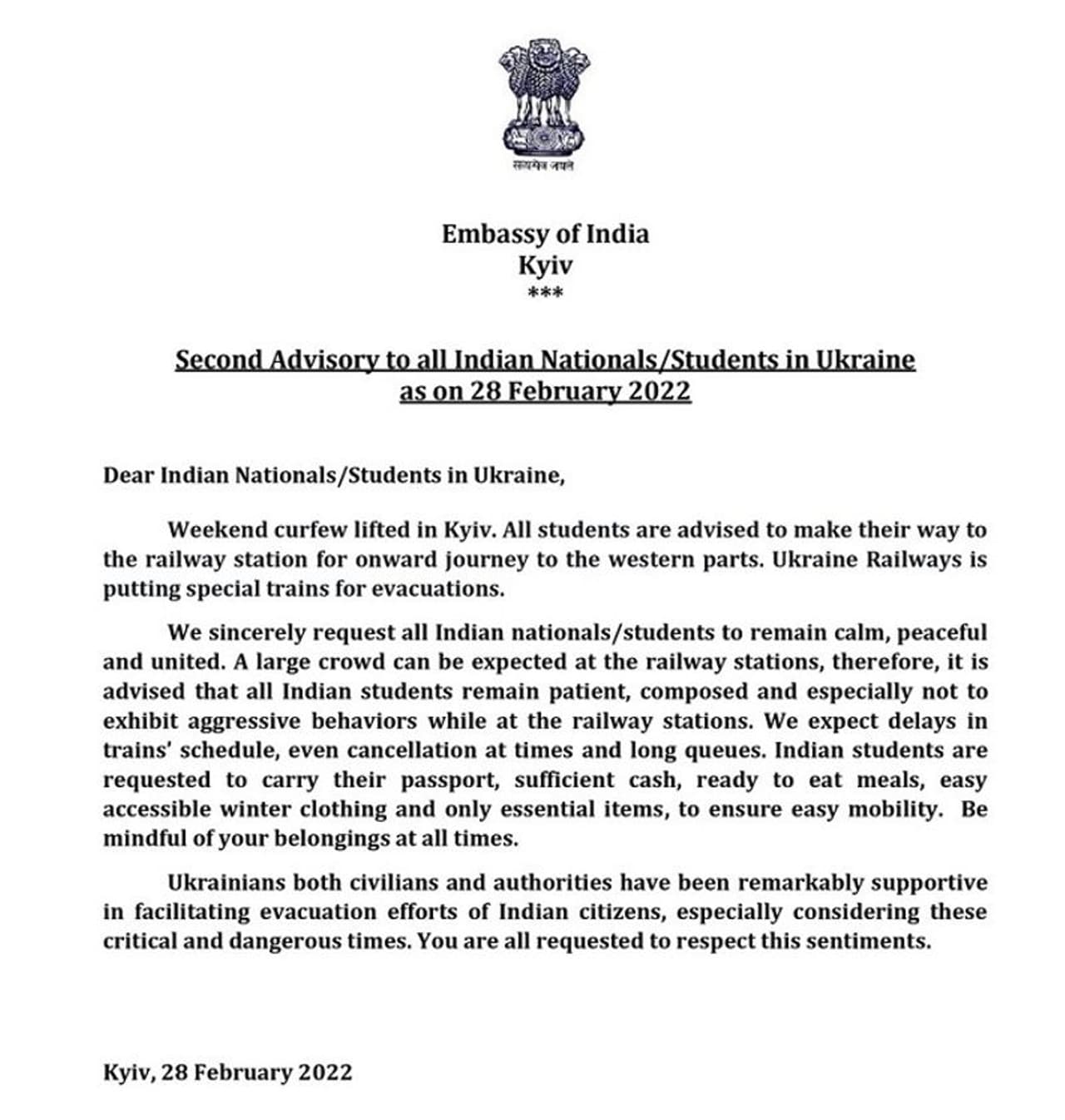 एडवाइजरी में बताया गया है कि भारतीय लोग और छात्र शांति से और एकजुट होकर रहें। रेलवे स्टेशनों में भारी भीड़ हो सकती है, इसलिए सलाह दी जाती है कि छात्र धैर्य रखें और रेलवे स्टेशनों पर उग्र व्यवहार नहीं करें। जो स्थिति है, उसमें ट्रेनें लेट भी हो सकती हैं, ऐन मौके पर कैंसिल भी हो सकती हैं और इनकी लंबी कतारें हो सकती हैं। भारतीय छात्र अपना पासपोर्ट, पर्याप्त मात्रा में नकदी, खाने का सामान साथ रखें और अपने सामान के प्रति सचेत रहें। एडवाइजरी में भारतीय छात्रों से कहा गया है कि यूक्रेन के नागरिक और अधिकारी, दोनों ही भारतीय लोगों को निकासी में मदद कर रहे हैं। ऐसे संकट के समय भावनाओं पर नियंत्रण रखें।