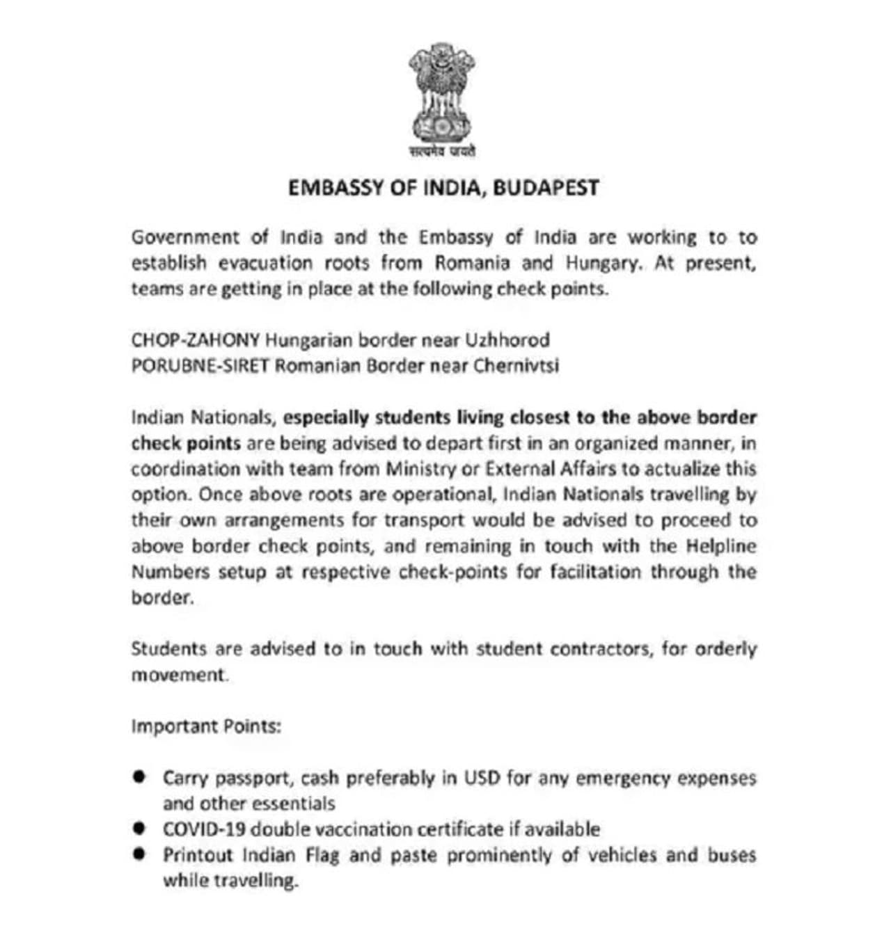 हंगरी में भारतीय दूतावास ने कहा कि भारतीयों खासकर छात्रों को उक्त सीमा चौकियों के आसपास के इलाकों में रह रहे हैं वे यातायात शुरू होने पर संगठित रूप से वहां पहुंचें। उन्हें इसके लिए विदेश मंत्रालय की टीम से समन्वय करने को कहा गया है। बता दें कि यूक्रेन पर रूस के हमले के चलते वहां फंसे भारतीय छात्रों की जान संकट में पड़ गई है। छात्र मेट्रो स्टेशन, बंकरों, हॉस्टलों और अपने फ्लैट्स में छिपे हुए हैं। यूक्रेन के विभिन्न शहरों में भारत के 15 हजार से ज्यादा लोग फंसे हुए हैं। करीब 4 हजार लोग वहां से निकल आए हैं।