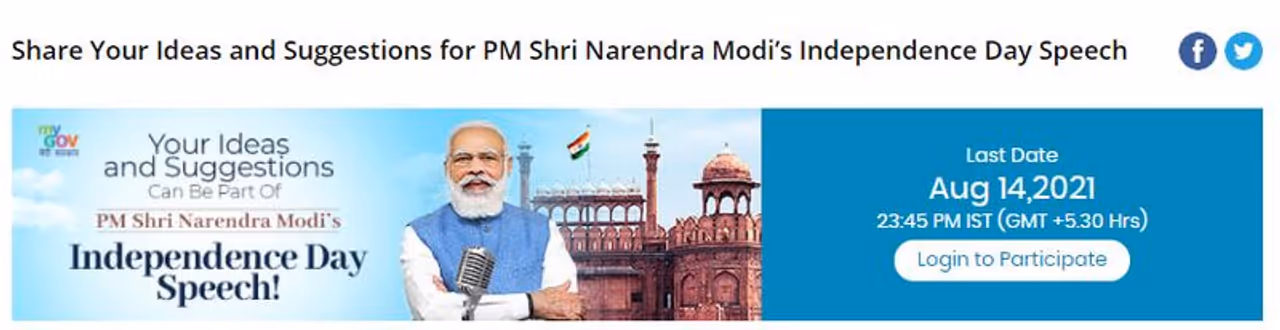 स्वतंत्रता दिवस पर लाल किले की प्राचीर से मोदी के जरिये गूंजेंगे आपके विचार। PMO ने देश की जनता से सुझाव और विचार मांगे हैं; जो भारत के सर्वांगीण विकास में आएं काम। अंतिम तारीख-14 अगस्त, रात 11.45 बजे तक है।
