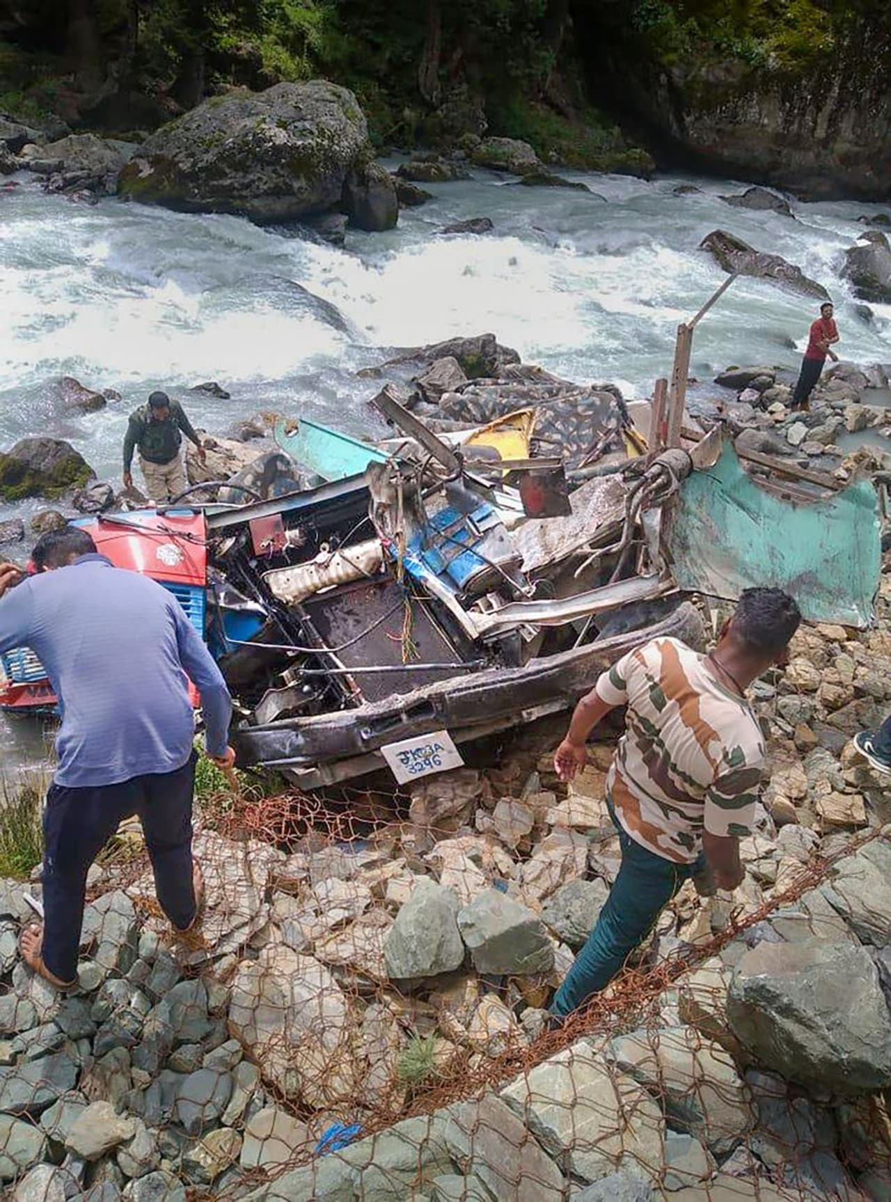 नदी में गिरने के बाद बस के इस तरह परखच्चे उड़ गए।