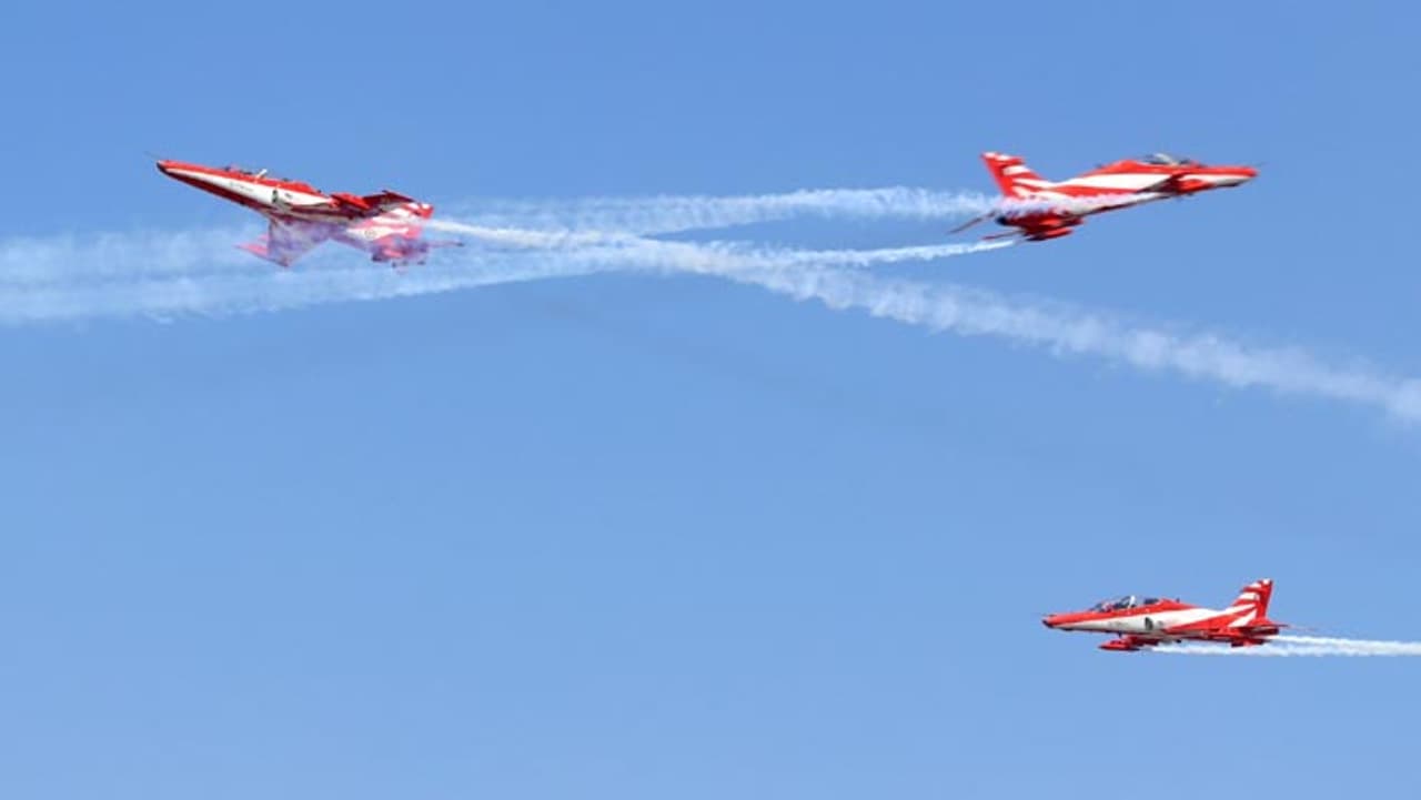 भारतीय वायु सेना के सूर्य किरण बैच ने शानदार करतब व युद्धाभ्यास दिखाकर सबका दिल जीत लिया।