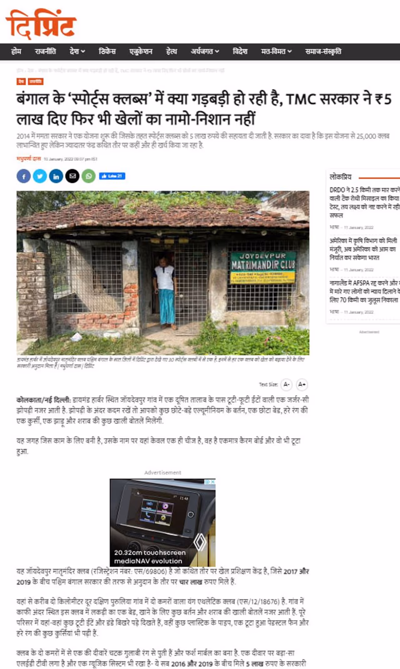 द प्रिंट ने इस मामले की सच्चाई दिखाने कुछ उदाहरण भी दिए। से-दक्षिण पुरुलिया गांव में दो कमरों वाला यंग एथलेटिक क्लब (एस/12/18676) है। क्लब में लकड़ी का एक बेड, खाने के लिए कुछ बर्तन और शराब की खाली बोतलें नजर आती हैं। इसे 2016 और 2019 के बीच 5 लाख रुपए सरकारी अनुदान मिला। ऐसे कई उदाहरण दिए गए हैं।