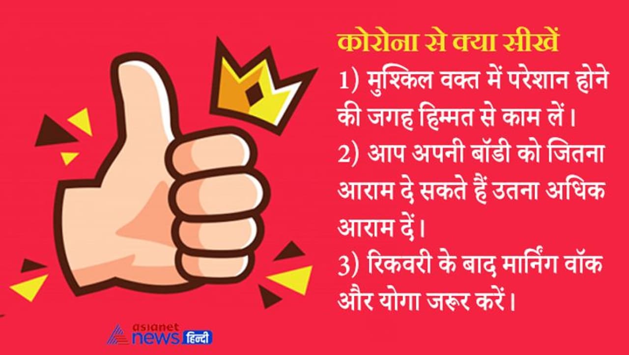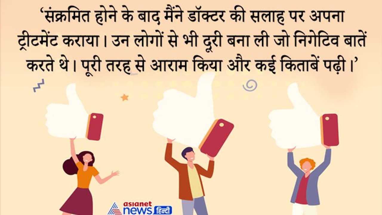 Asianet News के पवन तिवारी ने कोरोना को हराने वाले नीलेश से बात की। उनकी उम्र 34 साल है और वो मध्यप्रदेश के रीवा जिले के रहने वाले हैं। नीलेश ने 26 अप्रैल को फीवर आने के बाद अपना टेस्ट कराया। उनकी पत्नी को भी हल्का बुखार था। दोनों की रिपोर्ट पॉजिटिव आई। नीलेश ने कहा कि रिपोर्ट पॉजिटिव आने के बाद मुझे सबसे ज्यादा चिंता अपनी दोनों बेटियों की थी। डॉक्टर्स की सलाह में हम दोनों अलग-अलग कमरों में क्वारंटीन हुए और बच्चों को फैमली मेंबर्स ने संभाला। उन्होंने कहा कि कोरोना में कुछ विशेष बातों का ध्यान देना जरूरी है।