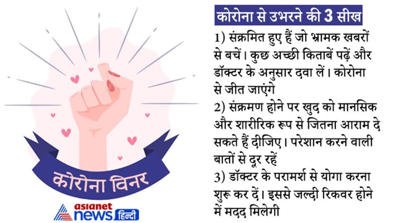 कोरोना से लड़ने के दौरान मुझे महसूस हुआ शारीरिक की बजाय मानसिक रूप से मजबूत होने पर संक्रमण को हराया जा सकता है। इसके लिए अच्छी किताबें और उन लोगों की कहानियां पढ़ना फायदेमंद होता है जिन्होंने पहले संक्रमण को मात दिया है। ऐसे में कोरोना को हराने की मेरी तीन सीख है।