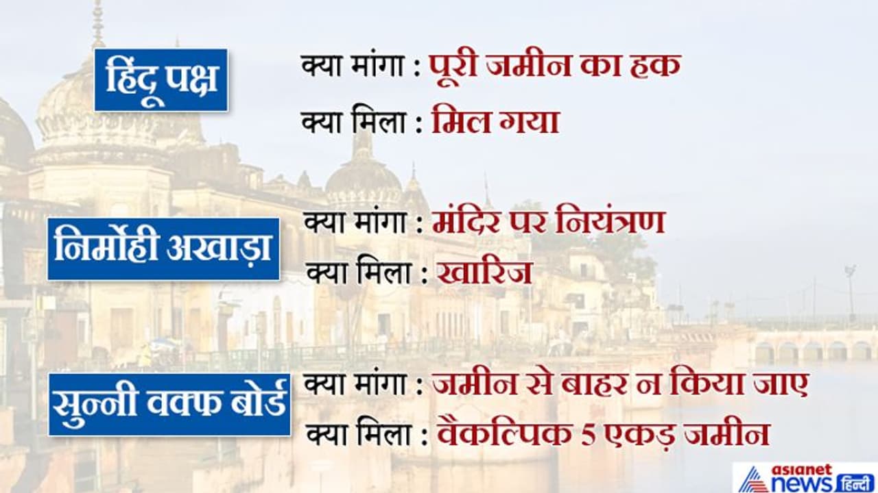 1- कोर्ट ने विवादित जमीन पर रामलला का मालिकाना हक बताया। कोर्ट ने यह माना कि मस्जिद के ढांचे के नीचे विशाल संरचना मिली थी, जो गैर इस्लामिक थीं। मुस्लिम पक्ष को कहीं और 5 एकड़ जमीन दी जाए।