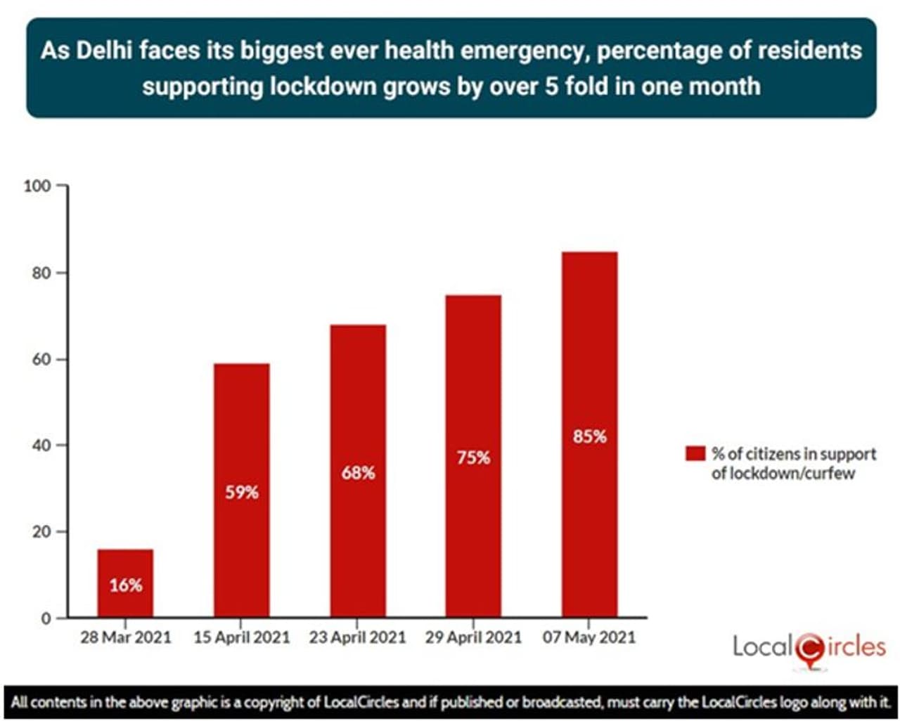 दिल्ली में कोविड के बेकाबू होने से लोगों को लाॅकडाउन सबसे बढ़िया विकल्प सूझ रहा। लोग लगातार इसके पक्ष में आ रहे हैं। सर्वे के अनुसार 28 मार्च तक दिल्ली के महज 16 प्रतिशत लोग ही लाॅकडाउन के पक्ष में थे। लेकिन 15 अप्रैल तक यह 59 प्रतिशत हो गया। 23 अप्रैल को हुए सर्वे में 68 प्रतिशत लोग लाॅकडाउन की हिमायत करने लगे। जबकि पिछले हफ्ते हुए सर्वे में यह 75 प्रतिशत हो गया। अभी 85 प्रतिशत लोग चाहते हैं कि लाॅकडाउन लगाया बढ़ाया जाना चाहिए। लाॅकडाउन की मांग करने वालों में पांच गुना वृद्धि हुई है।