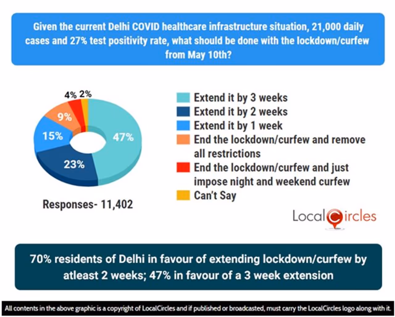 दिल्ली में कोविड केसों में अप्रत्याशित बढ़ोतरी से राज्य में हाहाकार मचा हुआ है। पूरा स्वास्थ्य सिस्टम लड़खड़ा गया है। स्वास्थ्य सुविधाओं के लिए लोग भटक रहे हैं। पिछले दिनों ऑक्सीजन की कमी से दर्जनों लोगों ने जान गंवाई। कोविड केसों के बेकाबू होने पर दिल्ली की केजरीवाल सरकार ने लाॅकडाउन लगा दिया था। पहले 3 मई तक यह प्रभावी रहा लेकिन फिर उसको बढ़ाते हुए दस मई कर दिया गया था। क्या लाॅकडाउन की अभी जरूरत है, इसे बढ़ाया जाना चाहिए। एक सर्वे एजेंसी ने दिल्ली लाॅकडाउन को लेकर क्या सोचती है, इस पर लोगों की राय जानी। इस सर्वे में 70 प्रतिशत लोगों ने कहा कि लाॅकडाउन कम से कम दो सप्ताह के लिए बढ़ाया जाना चाहिए। 47 परसेंट लोगों का मानना है कि तीन सप्ताह के लिए लाॅकडाउन को बढ़ाया जाए। जबकि 15 प्रतिशत लोगों का कहना है कि एक सप्ताह के लिए ही इसे बढ़ाया जाए। हालांकि, 9 प्रतिशत ऐसे लोग भी हैं जो लाॅकडाउन तत्काल खत्म करने और सारे प्रतिबंधों को हटाने के पक्ष में हैं। इस सर्वे में 11402 लोगों ने हिस्सा लिया।