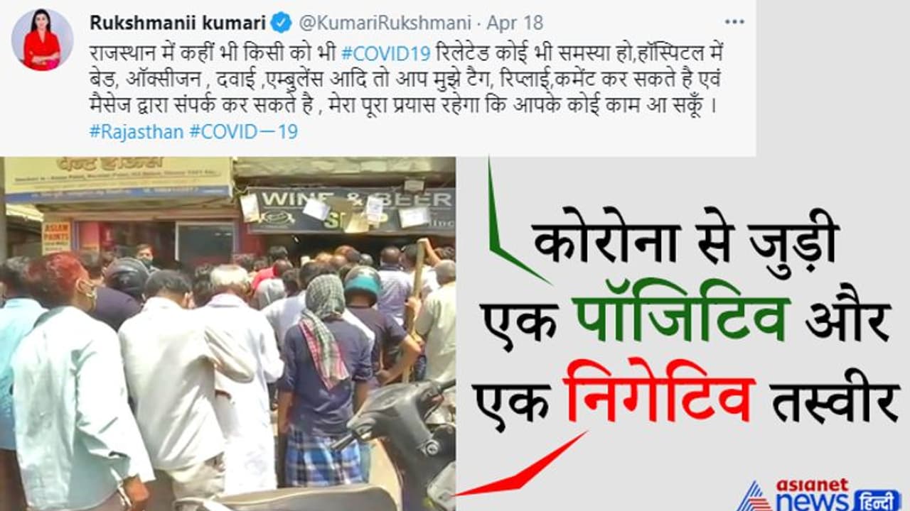 देश में कोरोना संक्रमण को रोकने महाराष्ट्र, मध्य प्रदेश, उत्तर प्रदेश, राजस्थान, छत्तीसगढ़ आदि कई राज्यों में कर्फ्यू लगाया गया है। इस दौरान लोगों की मदद के लिए कई लोग सामने आ रहे हैं, ताकि उन्हें अस्पतालों में जगह मिले, परेशानी न हो। यह ट़्वीट कांग्रेस नेत्री का है, जो मदद के लिए आगे आई हैं। लेकिन दूसरी तस्वीर दिल्ली में एक शराब की दुकान की है। दिल्ली में संक्रमण तेजी से फैल रहा है। 30 अप्रैल तक लॉकडाउन लगाने की घोषणा के साथ ही वाइन शॉप पर यूं भीड़ लग गई। इस तस्वीर ने प्रशासन और लोगों दोनों की लापरवाही को दिखा दिया। ऐसे कैसे हारेगा कोरोना?