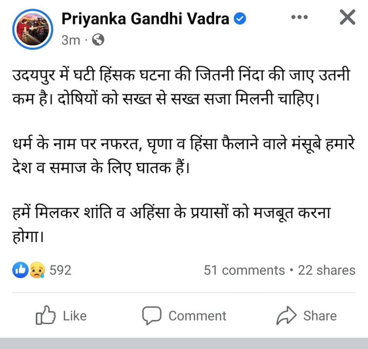 कांग्रेस महासचिव प्रियंका गांधी वाड्रा ने कहा कि उदयपुर की घटना की जितनी निंदा की जाए उतनी कम है। दोषियों को सख्त से सख्त सजा मिलनी चाहिए। धर्म के नाम पर नफरत, घृणा व हिंसा फैलाने वाले मंसूबे हमारे देश व समाज के लिए घातक हैं। हमें मिलकर शांति व अहिंसा के प्रयासों को मजबूत करना होगा।