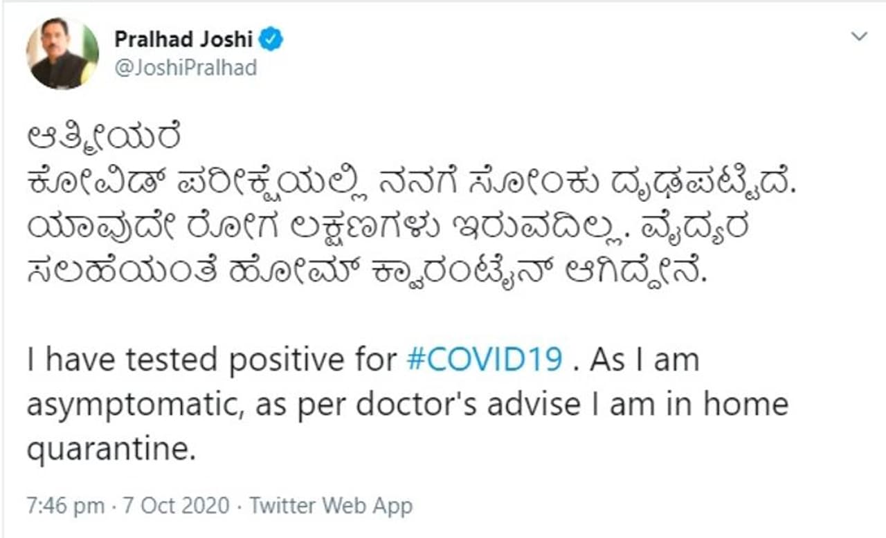 केंद्रीय संसदीय कार्य मंत्री प्रह्लाद जोशी की रिपोर्ट बुधवार को कोरोना पॉजिटिव पाई गई है। उन्होंने इस बात की जानकारी ट्वीट करके दी है। वे फिलहाल एसिम्टोमैटिक हैं और डॉक्टर की सलाह से वे होम क्वारंटीन हो गए हैं। वे कर्नाटक से आने वाले दूसरे केंद्रीय मंत्री हैं जिनकी कोरोना रिपोर्ट पॉजिटिव आई है।