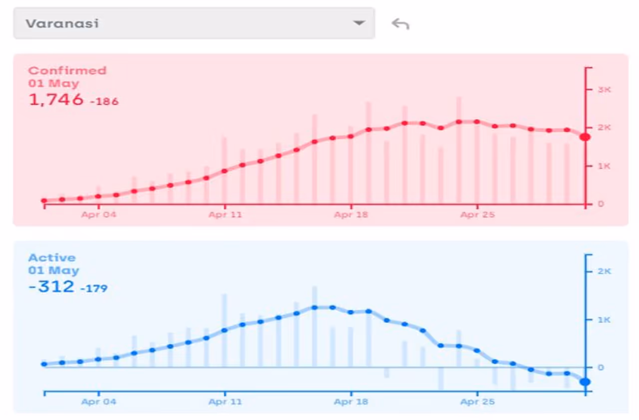 यूपी सबसे अधिक संक्रमित राज्यों की लिस्ट में था। यहां के कई बड़े शहरों में कोविड से त्राहिमाम है। लेकिन पिछले कुछ दिनों में तेजी से गिरावट दर्ज की गई है। पीएम के संसदीय क्षेत्र वाराणसी में एक मई को कोविड के 1746 कन्फर्म केस रिपोर्ट किए गए। इसमें 186 केसों की कमी दर्ज की गई है।