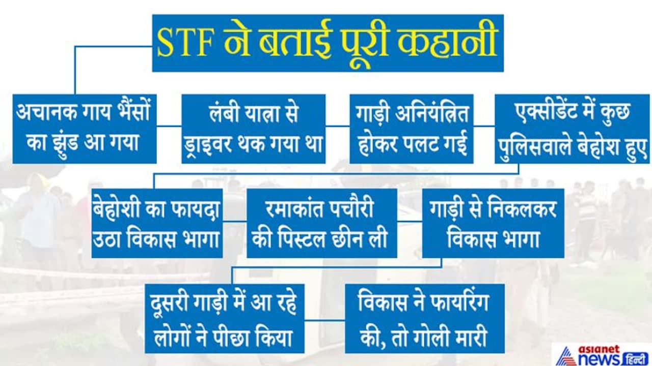 उत्तर प्रदेश के एडीजी प्रशांत कुमार का विकास दुबे के एनकाउंटर पर प्रेस कॉन्फ्रेंस की। उन्होंने कहा, विकास दुबे ने घायल पुलिसकर्मियों की पिस्टल छीनकर भागने की कोशिश की। पुलिस टीम ने पीछा किया और उसे घेरकर आत्मसमर्पण करने के लिए कहा गया, लेकिन वह नहीं माना। उसने पुलिस टीम पर जान लेने की लिए फायरिंग की। आत्मरक्षा के लिए पुलिस ने भी फायरिंग की, जिसमें वह घायल हो गया। इलाज के लिए अस्पताल ले जाया गया, जहां इलाज के दौरान उसकी मौत हो गई। घटना में चार पुलिसकर्मी घायल हुए हैं। इसके अतिरिक्त एसटीएफ के दो लोग घायल हैं।