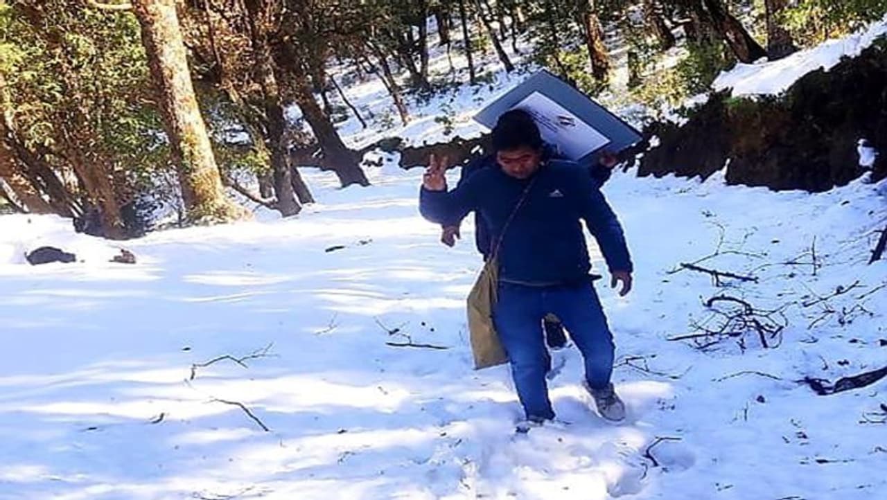 बर्फ से ढंके इस स्थान पर भी वाहन चलना मुश्किल थे, ऐसे में मतदान कर्मी अकेले ही मशीन और चुनावों से जुड़े सामग्री कंधे पर टांगकर पैदल ही निकल पड़ा। उत्तराखंड के देहरादून और मसूरी समेत कई इलाकों में बर्फबारी जारी है। इससे यहां का तापमान भी काफी कम है। यह फोटो पिथौरागढ़ जिले का है। यहां धारचूला विधानसभा के 18 और उत्तरकाशी जिले के 17 मतदान दल मतदान के तीन दिन पहले शुक्रवार को रवाना हो गए थे। यहां पहुंचने वाली टीमों को 14 से 18 किमी तक पैदल चलना पड़ा।