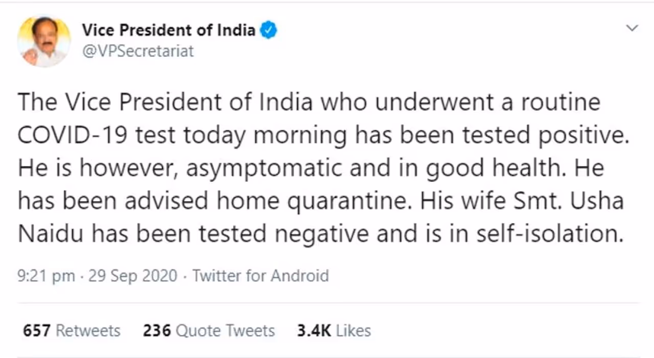 यह जानकारी उपराष्ट्रपति के सचिवालय की ओर से ट्वीट कर दी गई है। उपराष्ट्रपति के सचिवालय के वेरीफाइड ट्विटर हैंडल से ट्वीट कर कहा गया है कि उनका आज यानी 29 सितंबर की सुबह रूटीन कोरोना टेस्ट हुआ। इस टेस्ट की रिपोर्ट पॉजिटिव आई है। ट्वीट कर दी गई जानकारी के मुताबिक उपराष्ट्रपति का स्वास्थ्य बेहतर है और उनमें कोरोना के कोई लक्षण नहीं हैं।