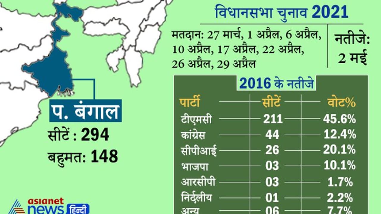 प बंगाल में 294 सीटें हैं। यहां 2016 में 6 चरणों में चुनाव हुए थे। ममता की पार्टी ने 293 सीटों पर चुनाव लड़ा था। इनमें से 211 सीटें जीतने में कामयाब रही थी। जबकि भाजपा 291 सीटों पर चुनाव मैदान में थी लेकिन उसे सिर्फ 3 सीटों पर जीत मिली थी। वहीं, गोरखा जनमुक्ति मोर्चा तीन सीटों पर चुनाव लड़ा था और तीनों पर जीत हासिल की थी।