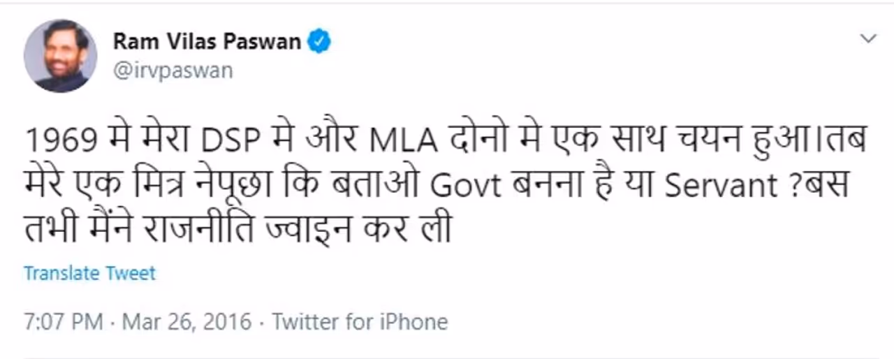 पासवान के गृह जिला खगड़िया के अलौली विधानसभा क्षेत्र में उपचुनाव होना था और वह घर जाने की बजाय पहुंच गए टिकट मांगने सोशलिस्ट पार्टी के दफ्तर। उस वक्त कांग्रेस के खिलाफ लड़ने के लिए कम ही लोग तैयार हुआ करते थे। सो टिकट मिल भी गया और वे जीत भी गए। पिताजी का दबाव पुलिस अफसर बनने पर था लेकिन दोस्तों ने कहा- सर्वेंट बनना है या गवर्नमेंट, ख़ुद तय करो। उसके बाद पासवान राजनीति की भूलभुलैया में उतरे तो पांच दशक तक सितारे के तरह चमकते ही रहे।