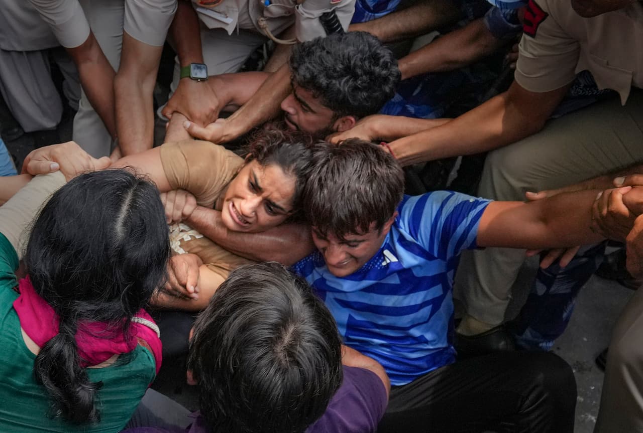 दिल्ली पुलिस ने जबरिया उठाकर, घसीटकर पहलवानों को हिरासत में लेकर थाने पहुंचाया।