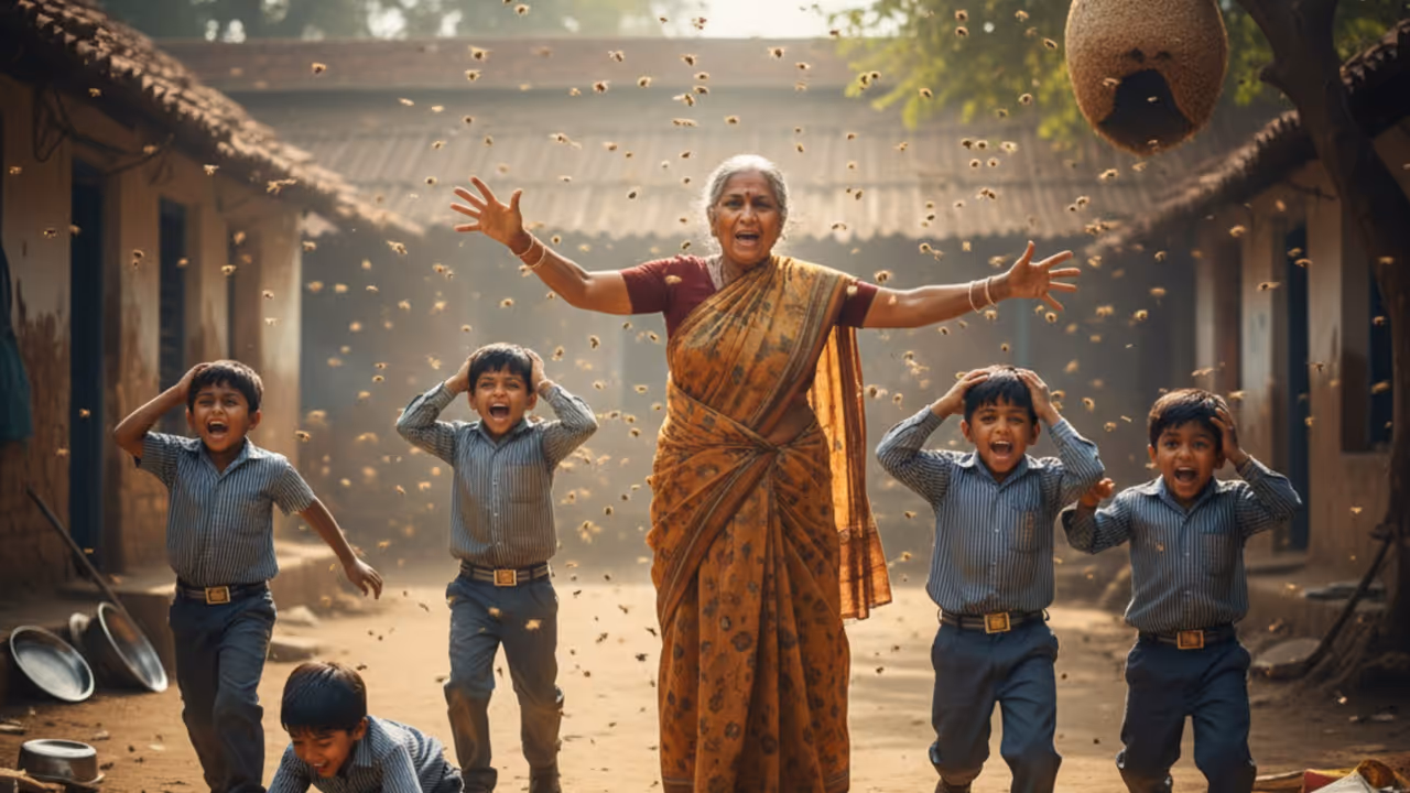 कंचन बाई ने पास में पड़ी तिरपाल और चटाइयां उठाईं। एक-एक बच्चे को उनमें लपेटा, अपने शरीर से ढकते हुए बच्चों को सुरक्षित कमरे के अंदर पहुंचाया। वह खुद मधुमक्खियों और बच्चों के बीच दीवार बनकर खड़ी रहीं।