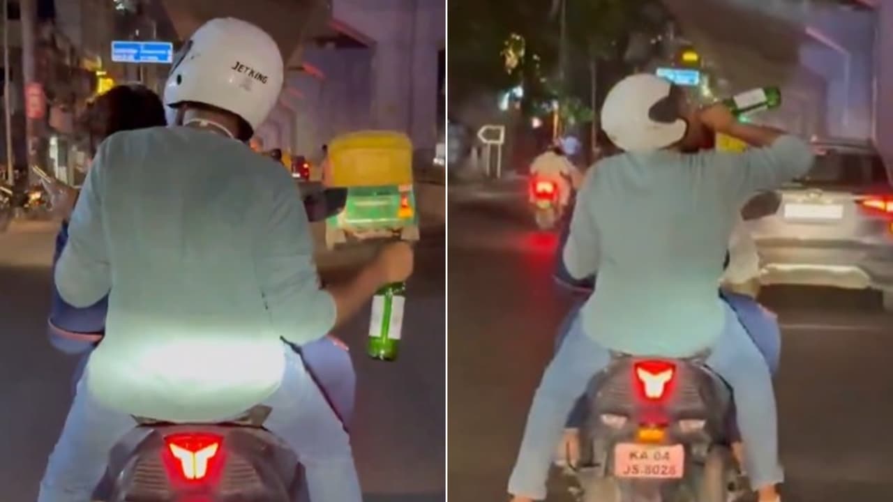 कर्नाटक के बेंगलुरु का एक हैरान करने वाला वीडियो वायरल हो गया है। इसमें तीन लड़के एक बिजी सड़क पर खतरनाक तरीके से मोटरसाइकिल चलाते दिख रहे हैं। बताया जा रहा है कि यह घटना BTM रोड की है। वीडियो में, बाइक पर तीन लोग सवार हैं, जो गैर-कानूनी है। उनमें से कोई भी सुरक्षा के बुनियादी नियमों का पालन करता नहीं दिख रहा। एक राइडर के हाथ में चलती बाइक पर बीयर की बोतल है। इससे भी ज्यादा चौंकाने वाली बात यह है कि पीछे बैठा लड़का खुलेआम बोतल से बीयर पी रहा है। ये ग्रुप लापरवाही से हाथ हिलाते हुए इशारे भी कर रहा है, मानो उन्हें पब्लिक सेफ्टी की कोई फिक्र ही न हो।