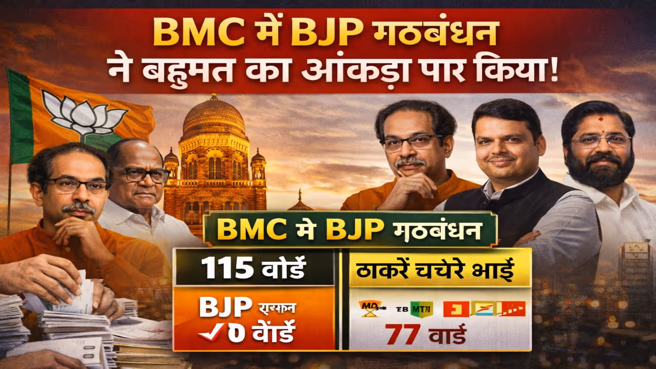 BMC Election Result 2026: BMC चुनाव 2026 में BJP गठबंधन ने बहुमत का आंकड़ा पार कर लिया है। 115 वार्डों में बढ़त के साथ सत्ता की तस्वीर साफ होती दिख रही है, जबकि ठाकरे चचेरे भाई पीछे रह गए हैं। क्या मुंबई की राजनीति में एक नया युग शुरू हो चुका है?