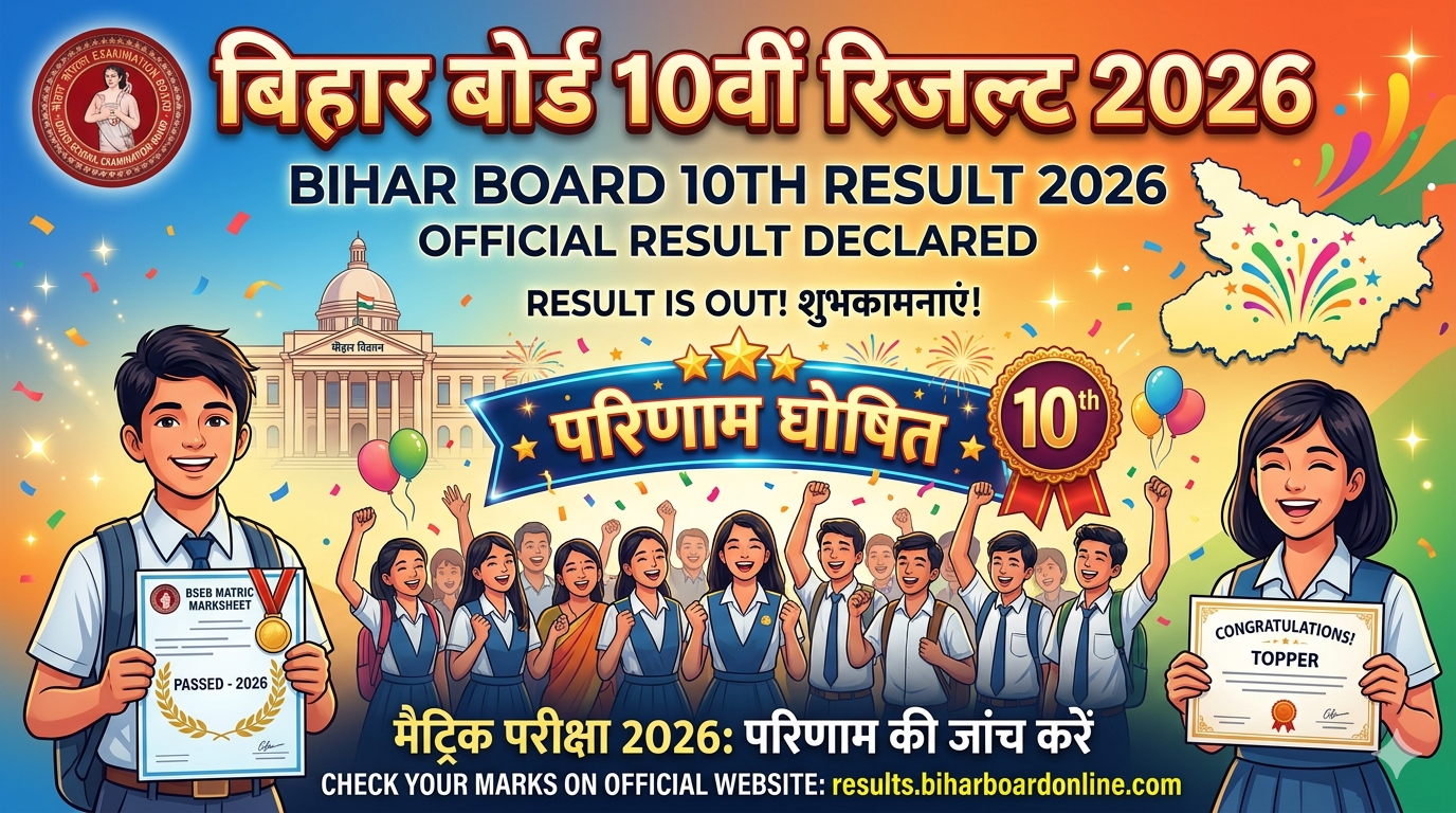 BSEB 10th Result 2026 घोषित! क्या आप जानते हैं Bihar Board 10th Result 2026 में टॉपर्स कौन हैं और आपका रोल नंबर पास हुआ या नहीं? कुल पास प्रतिशत 81.79%, 15 लाख से अधिक छात्र शामिल। SMS, DigiLocker और वेबसाइट से मार्कशीट डाउनलोड का सबसे तेज़ तरीका। जानें रैंक 1 से 6 तक टॉपर्स के नाम, अंक, नकद पुरस्कार और Medha Scholarship की पूरी डिटेल!